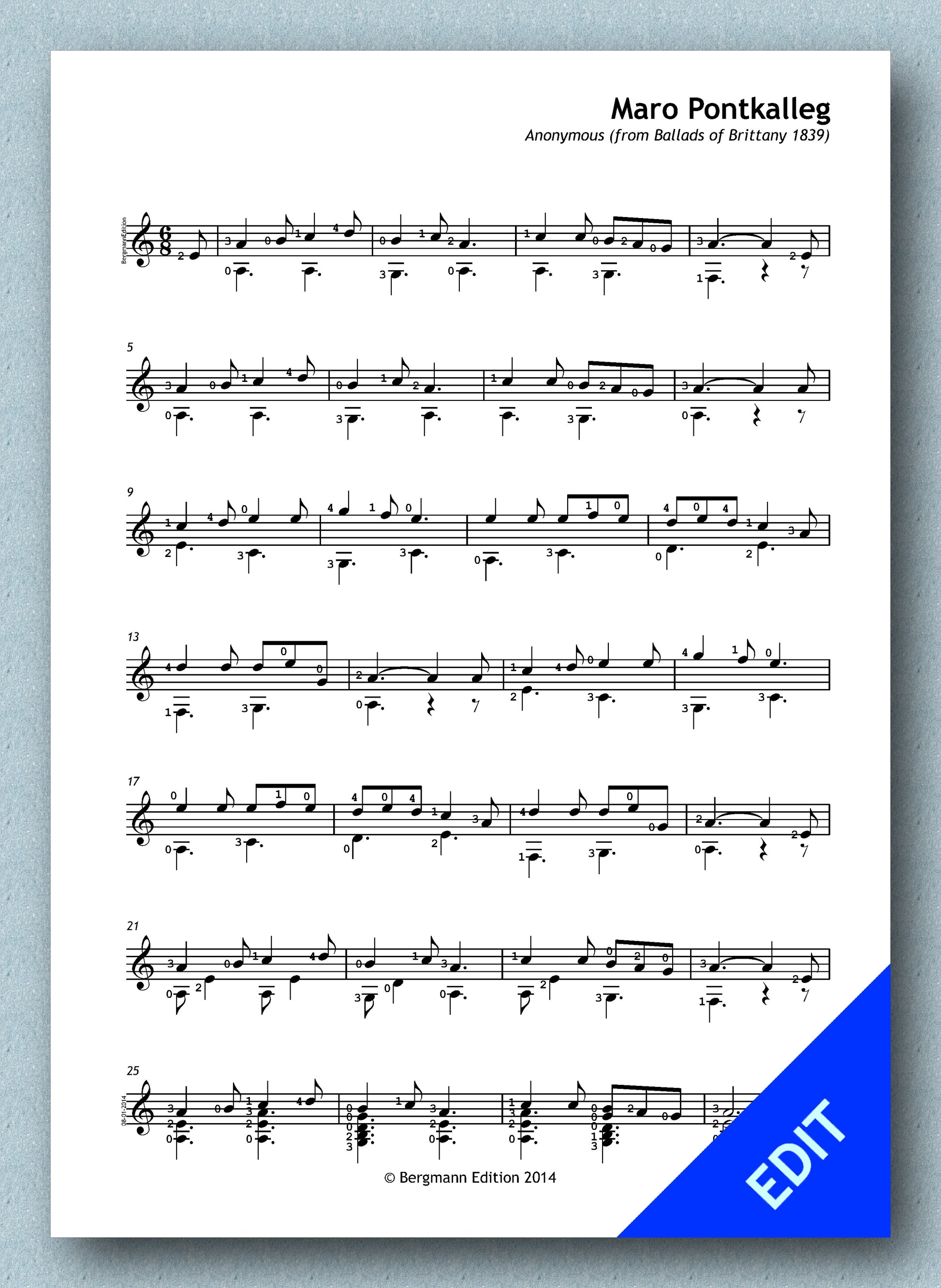 The piece is Breton in origin and was first recorded in the Barzaz Breiz (Ballads of Brittany) published by Théodore Hersart de la Villemarqué in 1839. A Maro is a Death Song or Mourning Song (cf Welsh Marwnad). Pontkalleg (Marquis de Pontcallec) was the supposed leader of a Breton Rebellion who was executed by the French government in 1720.