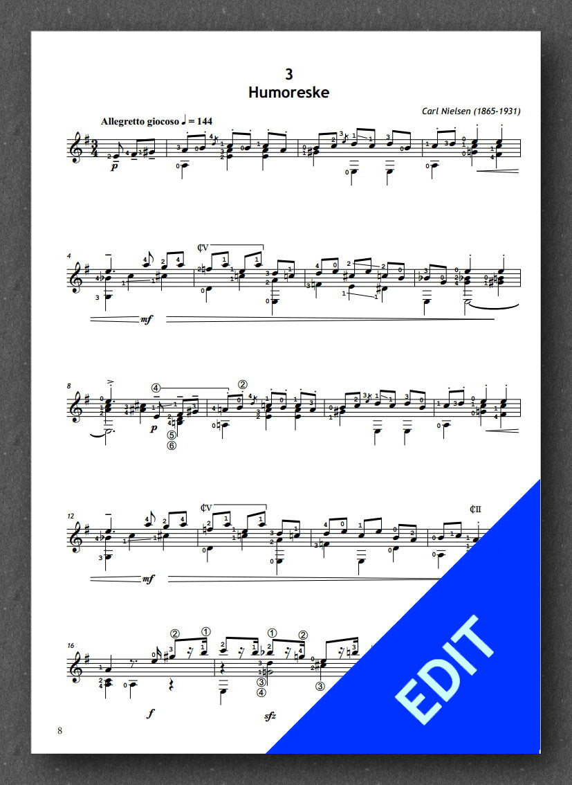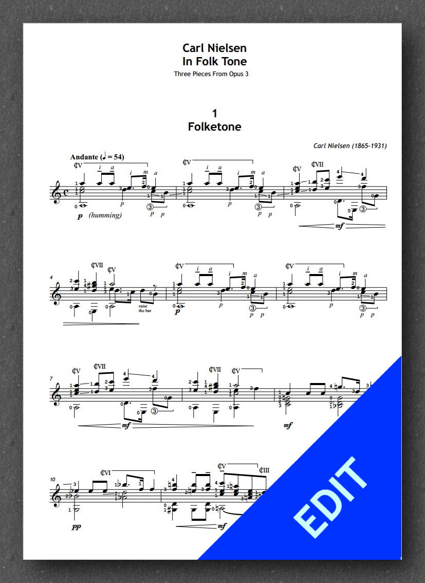 Carl Nielsen (1865-1931), In Folk Tone - Three Pieces from Opus 3: "Folketone", "Alfedans" and "Humoreske". The three pieces are carefully transcripted for guitar by Colette Mourey.