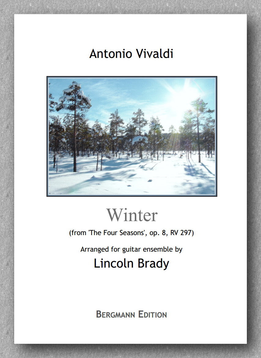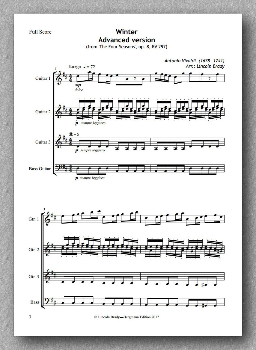 from Vivaldi's Four Seasons arranged for guitar quartet or guitar ensemble and bass-guitar by Lincoln Brady. The arrangement comes in two levels - easy and advanced. Both versions are included in both the Print on Demand and the PDF versions.