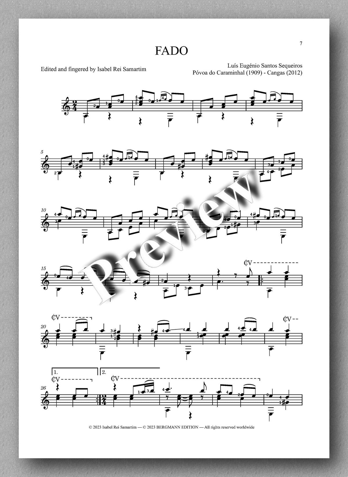 In the doctoral thesis A Guitarra na Galiza (USC, 2020), I studied various Galizan collections of music for guitar, performers, composers, teachers, builders of guitars and other strummed chordophones who made a fundamental contribution to the knowledge and repertoire of the guitar. This Galizan Fado composed by doctor and guitarist Luís Eugénio Santos Sequeiros (1909-2012) is a sample of his inspiration and identity with Portuguese music. Santos Sequeiros taught music to his daughters and sons, and there was a custom in the house of playing and singing. His sheet music collection contains several other original works of equal beauty and good composition, such as Trémolo a Conchita, published by Viso Editora and recorded, as well as Fado, on the CD Guitarra Galiza Vol. 1 (Air Classical, 2021). I thank the family for authorising this publication and we hope that this bottle thrown into the sea will touch the hearts of guitarists worldwide.